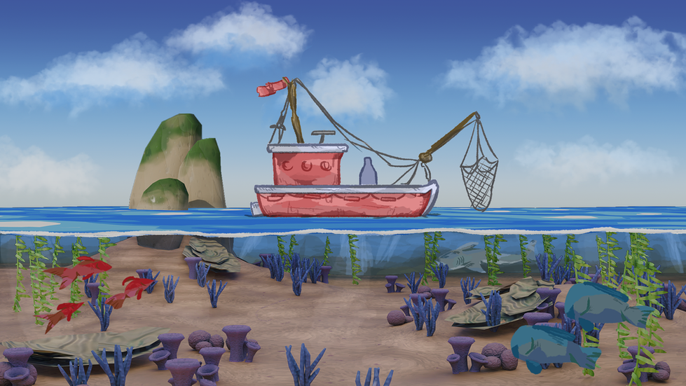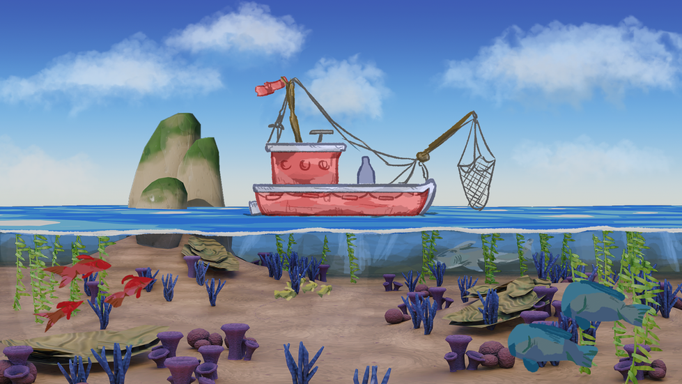 Part of the visual progression of the game happens as the player continues to increase the number of fish they are catching. This will cause the ecosystem to slowly degrade, the colours in the environment becoming less vibrant and the coral becoming bleached.